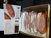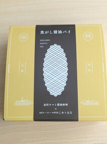 焦がし醤油パイはシンプルで洗練されたパッケージに包まれ、大きなサイズ感が目を引きます。個包装されているので、手軽に楽しめるのも魅力的です。層がしっかりとしたパイ生地が、食欲をそそる美しい焼き色をしています。