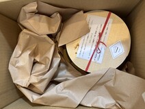 わくわくしながら段ボールを開けるとお店の焼き印の入ったオリジナルの木箱に平織の赤いリボンがかかってあってとっても可愛い!!