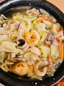 エビとか入ってる海鮮ちゃんぽんでマジで豚バラも入って野菜はもりもり入ってます