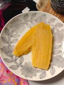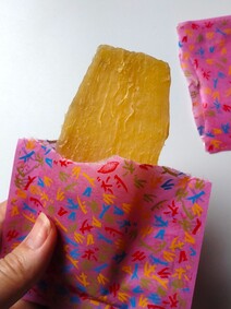 使用されているサツマイモは静岡産「べにはるか」。長方形の薄切りです。全部同じ形をしていて、このように均一なサイズと厚みでスライスするのは結構大変な作業なのだろうな、と思いました。干し芋はほんのりとした甘さです。本当に素材だけで勝負。思ったよりもあっさりしていました。しみじみと噛みしめる旨味。これぞまさしく完全無敵なヘルシースナッキングです。レンジで温めるとより一層美味しくなる、と書いてあったので500wで20秒ほどチン。ナルホドしっとりしてまた違う味わいになりました。甘みが少しアップする気がします。私は温めた方が好きかな~。