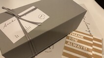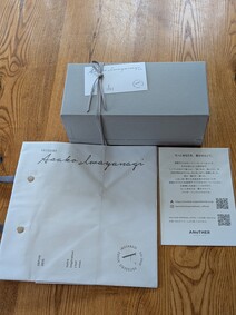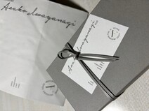段ボールをあけるとふた部分にメッセージとロゴ。梱包箱まで特注というこだわりにまず驚き。さらに、絶妙の力加減で台紙に貼られたビニール1枚で商品がしっかりと固定されるよう工夫された仕様にまた驚かされます。最高の状態で品物を届けたいという想いを細部にまで感じました。
