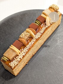 岩柳氏の感性が詰まったビジュアルは、ただただ美しい。ケークにはお馴染みの生チョコ、アーモンドなどの洋素材に加え、白ゴマやごま餅など、洋菓子ではあまり使わない、和の素材をトッピングと生地に使用。適度なきめ細かさと気泡を含んだ生地はしっとりと滑らかで、かつ軽やか。和と洋のトッピングを、それぞれに生地と味わうことで、和と洋、異なる味わいに。緻密に計算されたその構成にプロの仕事を感じました。これ、もはやスイーツではなく「作品」です。
