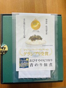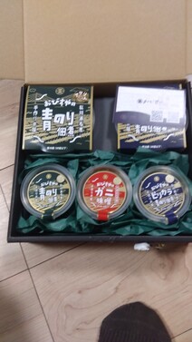 福島三陸沖の青のりセット!無事にクール便にて届きました。箱も見てみると、3種「アサリ入りの青のり」「ピリ辛青のり」「ガニ味噌」そして青のり2種の大パック。計5個