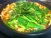 野菜はキャベツ、ニラ、ごぼう、ネギあと豆腐を用意して 付属の辛味噌スープをとモツと一緒に鍋へ入れました◎