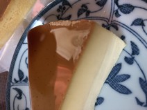 切ってみても食感もお豆腐?とも思ったりもしたし甘さも控えめでもっちり食感といった表現で合ってるかなと思います。