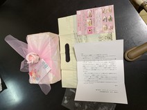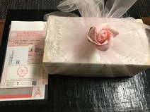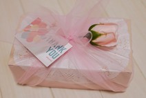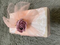 箱を開封すると、すぐ目にとまる可愛い造花とチュール生地でラッピングされている箱です。とても素敵で、贈り物にお勧めできます。