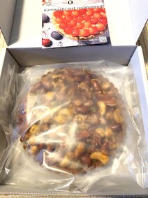 どこから切ろうか迷いながらも、6等分するのがちょうど良いかな〜と思いカット。思ったよりも綺麗に切れました。断面にはベリーソースが見えます。まず一口食べると、ナッツがガツンと来た後に酸味のあるベリーの味がしました。ラズベリーとブラックベリーが入っているようです。タルト生地はサクサクなタイプ、キャラメルソースは思ったよりも甘すぎず、コーヒーよりもワインに合いそうだと思いました。中の案内を読むとトースターで2〜3分リベイクするとタルト生地がサクサクになりオススメと書いてあったのでやってみました。サクサク感が更に増し香ばしく、新しい食感に生まれ変わりました。一切れでも食べ応えがあり満足させてもらいました。