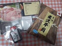 段ボールをあけると、サシが入った見た目から美味しそうな、米沢牛の切り落としがたっぷり500g、牛丼のタレ、レシピやカタログが入っていました。
