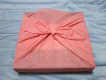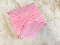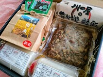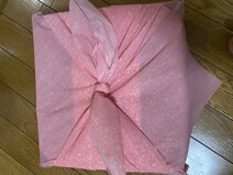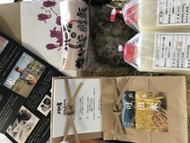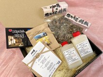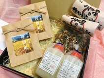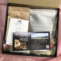 風呂敷を解くと、お米・焼き鳥飯の素・スープ・きざみのり のセットが入っています