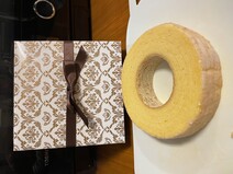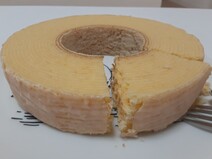見た目は普通のバームクーヘン。直径15センチほどでしょうか。外側はチョコレートでコーティングされています。早速ナイフで切って一口食べてみると、、、おいしい!軽くてふわふわでしっとり、甘さが控えめなためくどさもありませんでした。一人暮らしのため全部食べきることができるか不安でしたが、ぱくぱく食べられます。むしろ一気に全部食べてしまいそうになったので我慢したぐらいです。それぐらい軽くて飽きが来ない味だと思います。