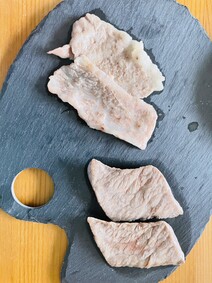 カッパと聞いてお肉でそんな部位があるのかとびっくり!外バラと呼ばれる部分の更にお腹の皮と脂の間にある一頭からわずかしかとれない希少なお肉とのこと。