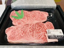 そして、冊子の下から2枚のステーキと牛脂が登場。大きさと厚みがあり、綺麗な赤身にきめ細かく入ったサシが美しく、期待が高まります。贈答用としても十分すぎるクオリティだと思います。