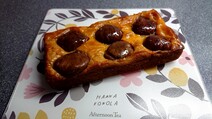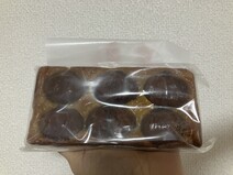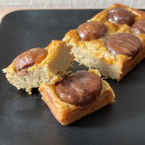 スイートマロン自体は少し小ぶりかなという印象ですが、上にドンと乗っている6つの栗の渋皮甘露煮がとてもインパクトがあります。開封した途端にバターの美味しそうな香り。おすすめの食べ方通りに、生地と栗の部分が一緒に食べられるようにカットします。