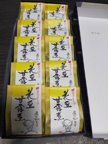 箱にお地蔵さんが描かれていて、お盆だね、とみんなほっこり。箱を開け1つ手にすると叔父が「重いな」と。小さい袋に入っているのに、ずしっと重みがあります。祖母に渡すと「大きい豆がいっぱい入ってる」と言い、1つ食べると笑顔になりました。甘党の叔父はお茶も飲まずに「うまいうまい」と映画の某キャラクターのように食べています。お茶を準備してくれた従姉妹が「出遅れた!」と言って座り、叔母も加わりみんな揃って食べました。1袋に8〜9個入っていて、祖母と私は半分こして食べました。従姉妹と叔母も半分こしたので、女性なら2回に分けて食べても良さそうです。