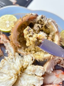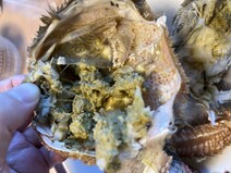 甲羅を外すと、カニミソが思った以上にたっぷり入っていてビックリ!全ての足に、身もぎっしり詰まっていました。