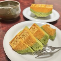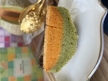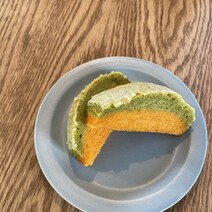 鮮やかな緑とオレンジ色の層になっていて、周りには砂糖のコーティングがされています。