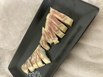 食べ方のインストラクションも同封されており、その通り、半生でスライス。開封した瞬間からスモーク香が漂い、思わず、つまみ食いしてしまおうかと思いましたが、まだ、半生でしたので、ここは我慢。とりあえず、スライスし、冷蔵庫に再び入れ、解凍を待ちます。