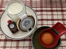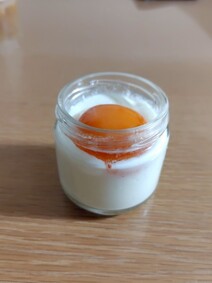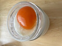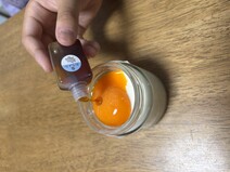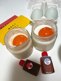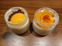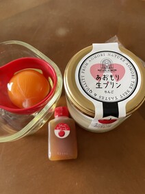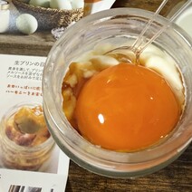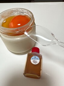 看板商品の塩カラメル、黄身を潰してプリンと特製塩カラメルソースを混ぜながら味わう。津軽海峡の旨みを凝縮した塩を使った柔らかいトロトロプリン。