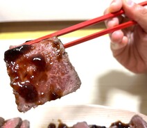 その説明を読みながら実際にお肉をカットしていただきました。そのままでも美味しくいただけるようでしたが、専用のタレが付属していたのでそちらを使用しました。