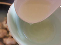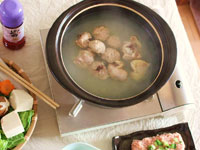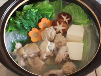 まずはスープを温め、迫力満点の骨付き肉を入れます。煮立ったところでスープだけを一口含むと、程良い塩加減の濃厚な鶏の旨味が広がります♪