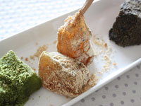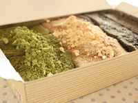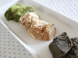 今回は定番のきなこに加え、宇治の早摘み抹茶を使用した緑鮮やかな「抹茶」と、黒ごまをふんだんに使ったオリジナリティー溢れる「竹炭」の3種入りを頼みました。