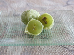 少し凹凸のある形は天然そのもので、ゆっくり口に含むと柔らかな求肥の中から果汁があふれ出ます!
