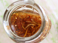 春の訪れを感じる瀬戸内海産のちりめんじゃこをはじめ、刻みにんにく、玉ねぎ、ショウガなど13種類の素材がたっぷりのオリーブオイルに漬けられています。