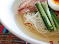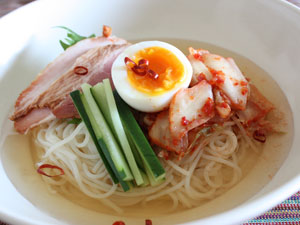 旨味の強い水キムチスープで食べる、つるつる冷麺