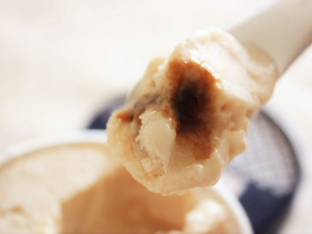 本物の信玄餅と同じ小花がプリントされた可愛らしいカップを開けると、きな粉風味のバニラアイスの中央に黒蜜が配され、アイスの中に小振りながらも柔らかな餅が幾つか入っていました。味は完全に「クリーミーな信玄餅」ですね~。