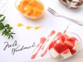 パッションフルーツ、コーヒー、いちごソースと一緒にいただく、ぷるっぷるの洋風わらび餅