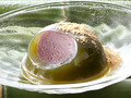宇治抹茶入りのわらび餅の中には、さらりとなめらかなこしあんが入っています♪