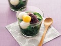 もちもちの抹茶ゼリーに、白玉や栗、小豆が入っています。緑茶でさっぱりいただくと、夏の和の風情が感じられます。